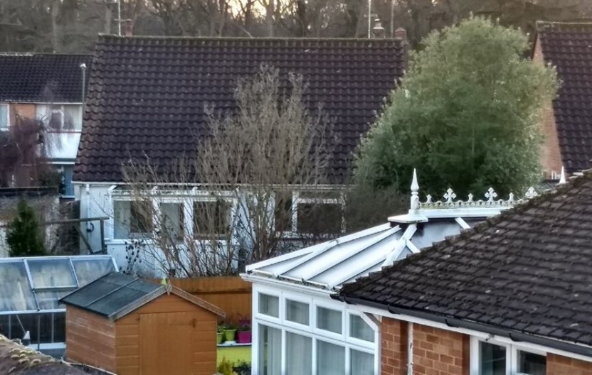 The photo below is from inside our conservatory to show how close this property is already. If plans were permitted, the ridge that is currently 14m away from our fence will extend to the two gables which will then be only approx. 5.5m away which is extremely close. The highest point that you see in the photo will come 8.5m closer. The proposed plan will also cut down the light, especially in the Winter with a low sun (see ref below).